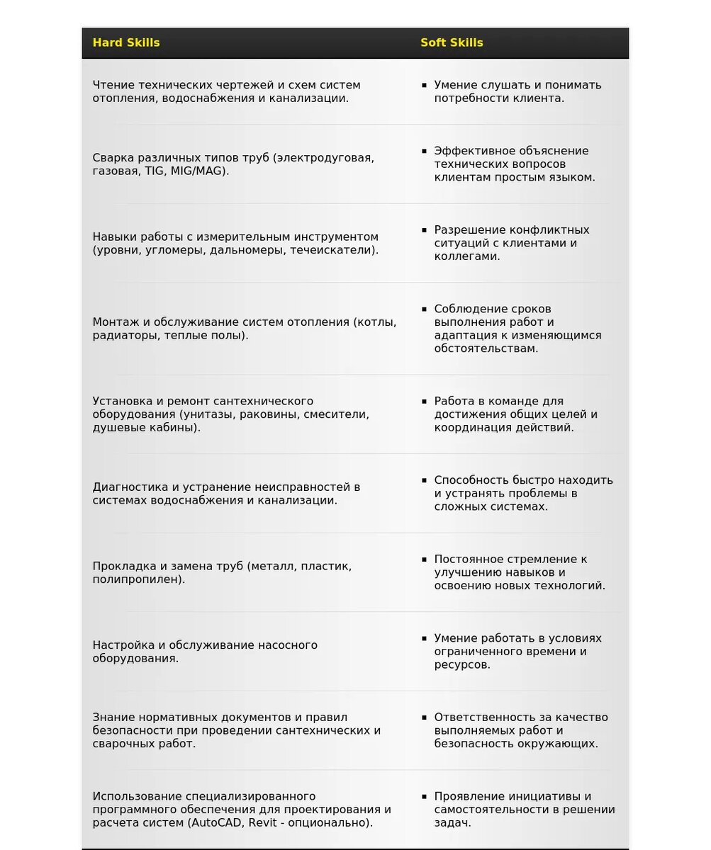 - Перечислите свои ключевые навыки: например, "Владею всеми видами сантехнических работ, включая установку, ремонт и обслуживание систем отопления, водоснабжения и канализации. Имею опыт сварки стальных и полимерных труб".