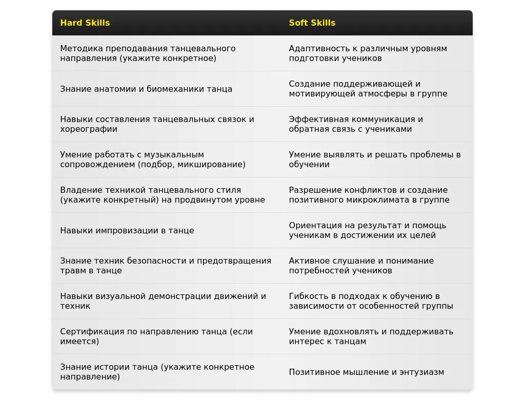 - Инструктор по бальным танцам: "Обучила бальным танцам", "Подготовила пары к соревнованиям", "Разработала программу индивидуальных занятий".