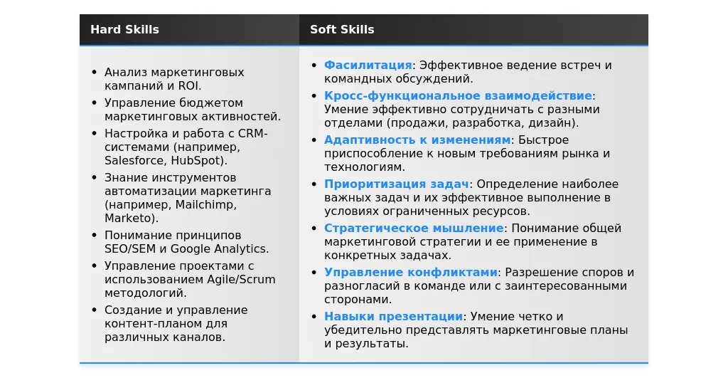 - Разделите навыки на категории: разделите навыки на категории (например, "Маркетинговые навыки", "Аналитические навыки", "Коммуникативные навыки").
