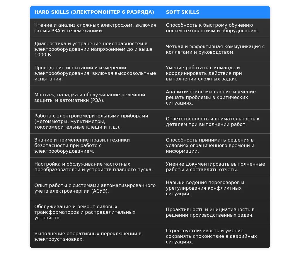 Технические навыки: Чтение и понимание электросхем (продвинутый), знание основ электротехники (продвинутый), знание ПТЭЭП (средний). Навыки работы с оборудованием: Работа с электроинструментом (продвинутый), работа с измерительными приборами (средний), обслуживание электрооборудования (средний).