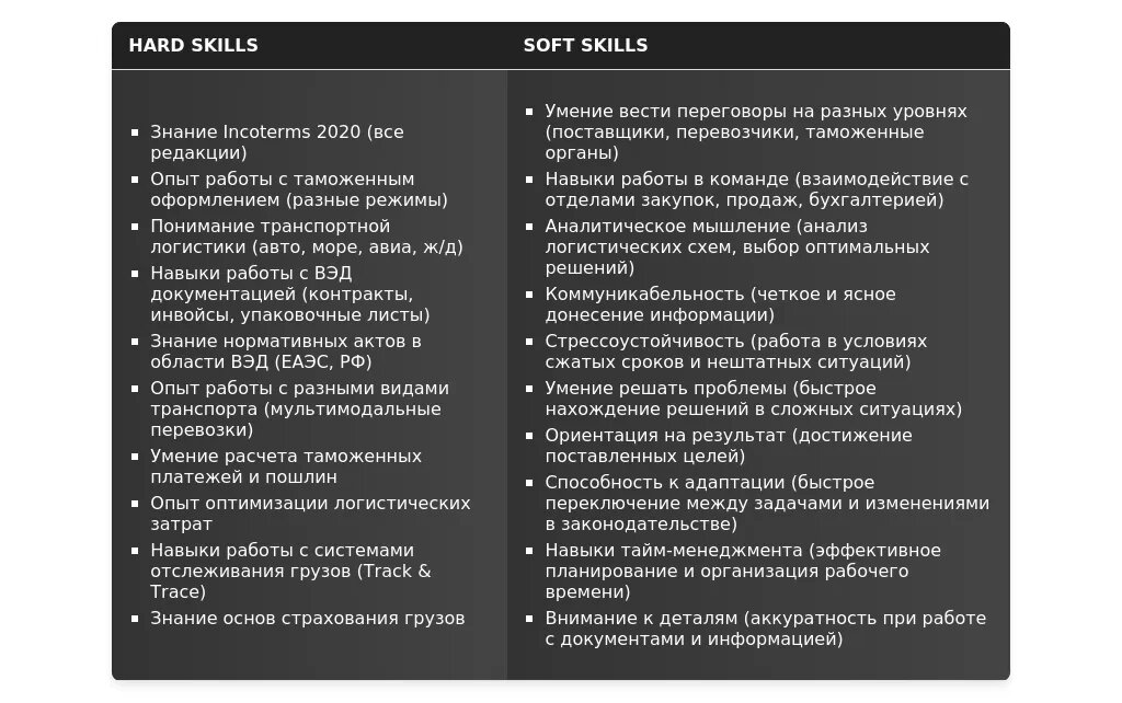 Ключевые навыки: таможенное оформление, ВЭД, переговоры, Incoterms