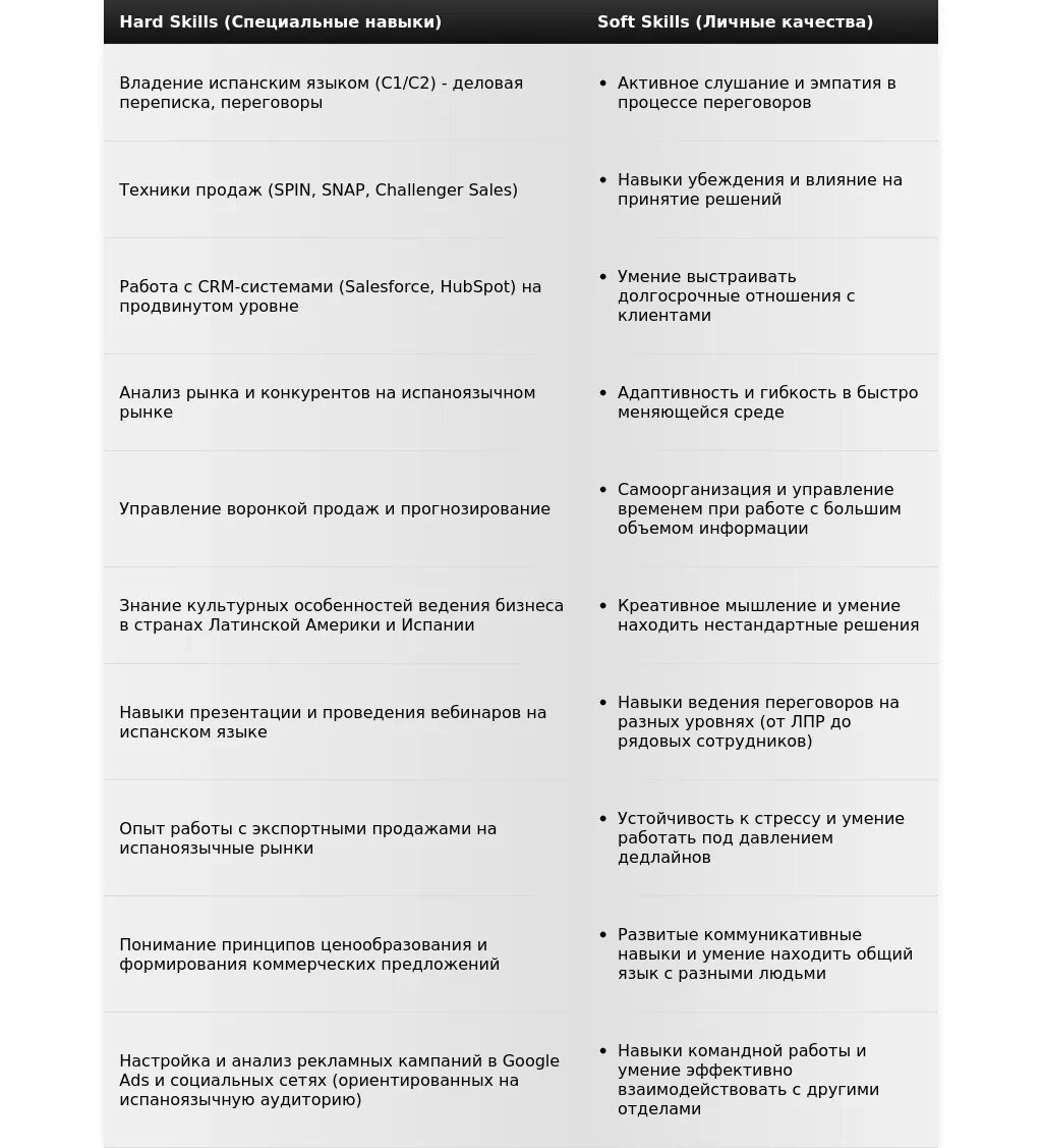 - На какие качества и навыки делать акцент: Коммуникабельность, умение убеждать, знание испанского языка (уровень), обучаемость, нацеленность на результат.