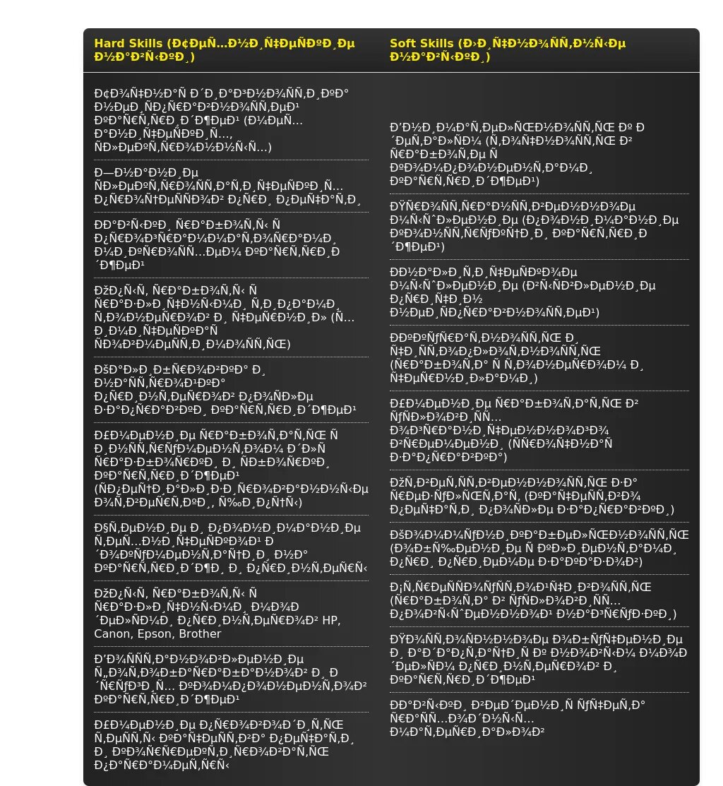 - Перечисление навыков без контекста:❌Пример: "Знаю Word, Excel, умею заправлять картриджи."Почему это плохо: Не показывает, как эти навыки применялись на практике и какие результаты принесли.