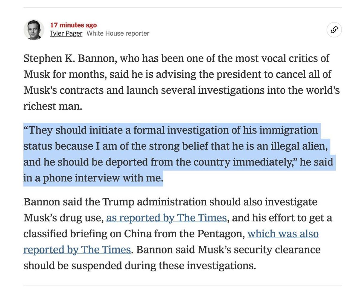 В ответ на пост Экс-советник Дональда Трампа призвал депортировать Маска из США. Стив Бэннон заявил, что нужно открыть расследование об иммиграционном статусе Маска, чтобы его можно было немедленно выслать из страны.