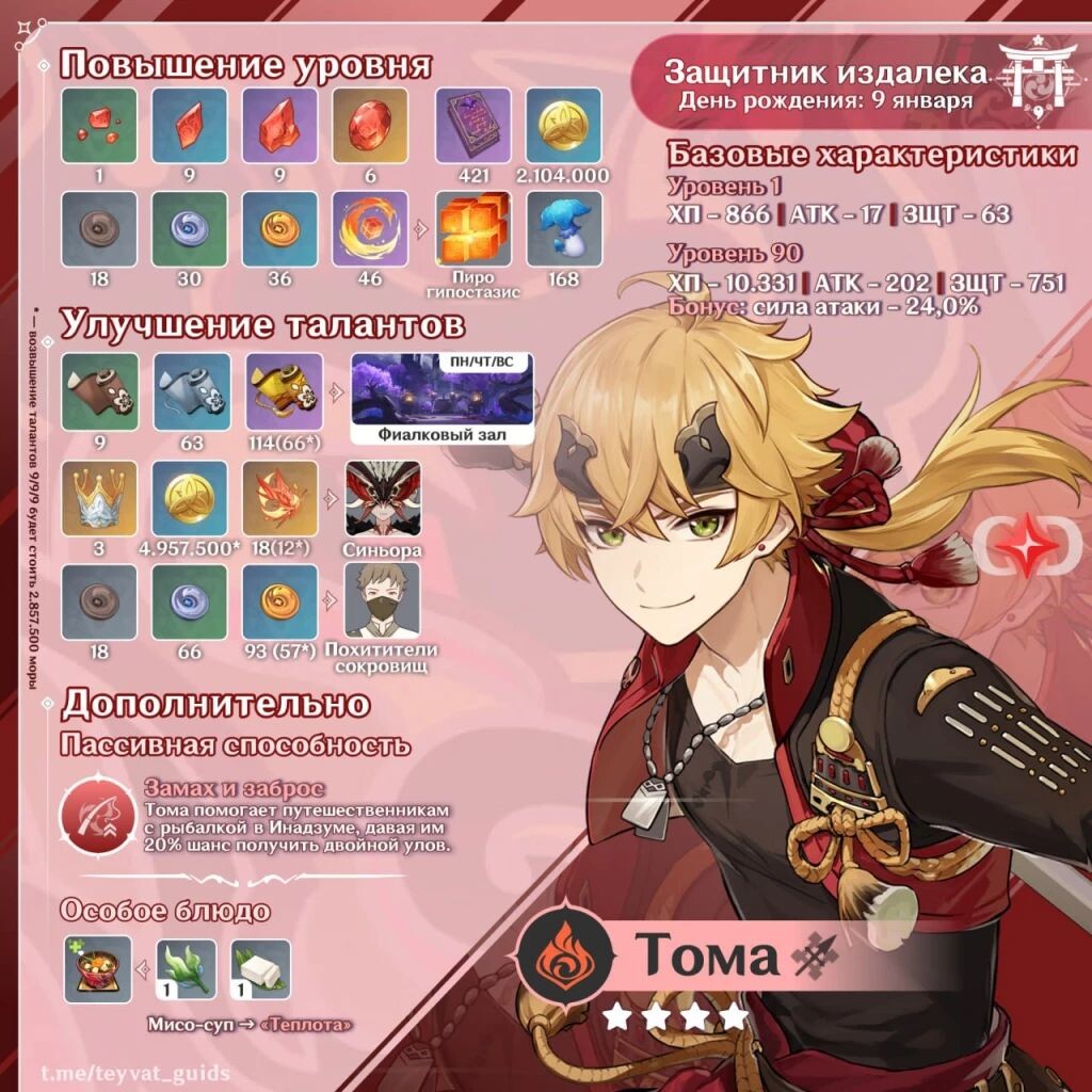 ㅤТома — Пиро персонаж эпической редкости, который пользуется древковым оружием. Это гибкий саппорт, которого можно собрать как и в качестве обычного щитовика, так и для Пиро статуса, например, в отряды Цветения.