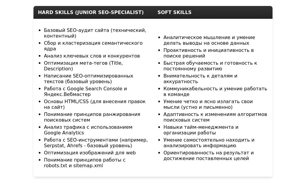 - Скрытые требования: Готовность работать в команде, умение быстро обучаться, интерес к новым технологиям в SEO.