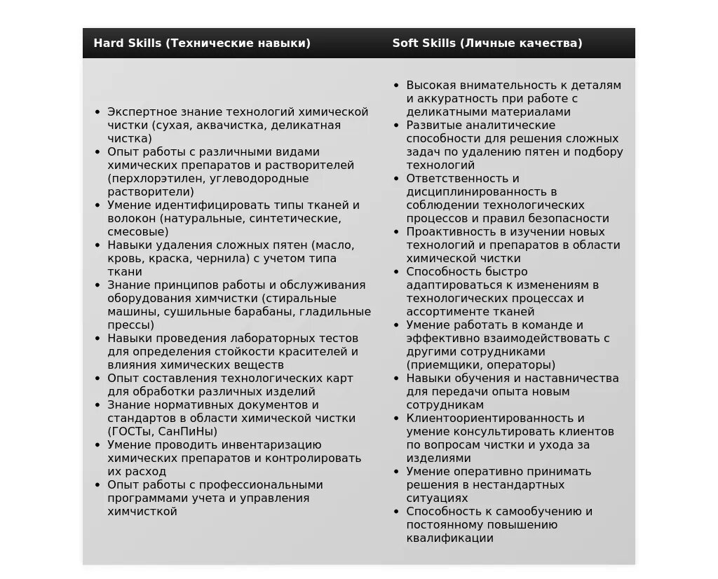 - Технолог химчистки (работа с кожей и мехом): "Опыт работы с кожей и мехом", "Знание технологии безопасной чистки кожи и меха", "Умение восстанавливать цвет и структуру кожи".