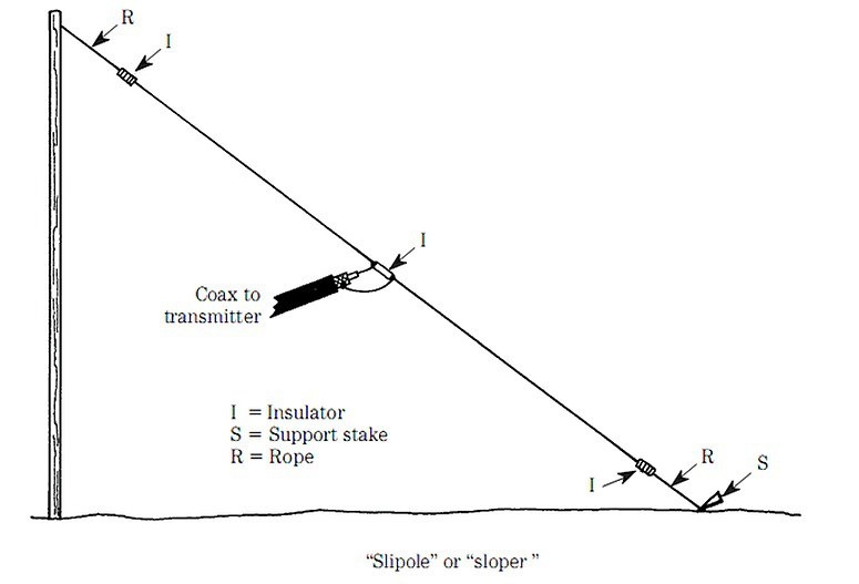 🔹 Наклонный диполь популярен среди тех операторов, которым нужен низкий угол излучения, и которые не перегружены большим количеством земли для установки антенны. Эта антенна также называется слопером и slipole в различных текстах.