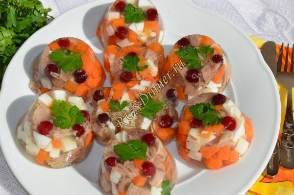 Заливное мясо От автора: Заливное мясо должно придать вашему праздничному столу очередную изюминку, ведь это самое главное. Ингредиенты: Говядина - 300 гр. Лук репчатый - 1 шт. Морковь - 200 гр. Яйцо - 2 шт. Соль - 10 гр. Перец душистый горошек - 1 гр. (6 горошин) Лавровый лист - 3 шт. Петрушка - 1 пуч. Желатин - 20 гр. Клюква - 20 гр. Вода - 1500 мл. Источник: https://rusdinner.ru/page/zalivnoe-mjaso