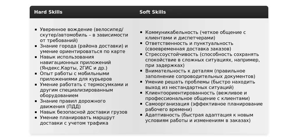 - Доставка еды: "оперативная доставка заказов", "соблюдение температурного режима", "работа с термосумкой", "вежливое общение с клиентами".