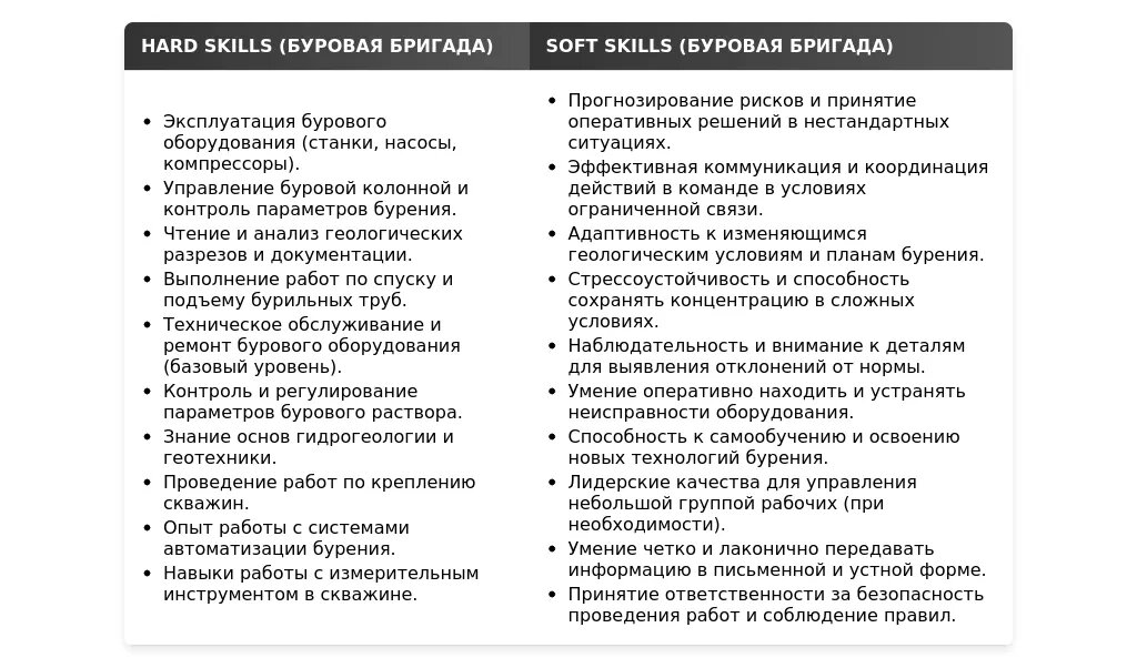- Бурильщик: "выполнение буровых работ", "роторный способ бурения", "соблюдение техники безопасности", "монтаж и демонтаж бурового оборудования", "оптимизация технологического процесса".