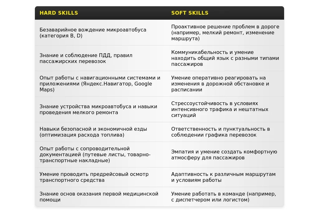 - **Развозка персонала:** "Пунктуальность и ответственность", "Отличное знание города", "Умение работать в команде".
