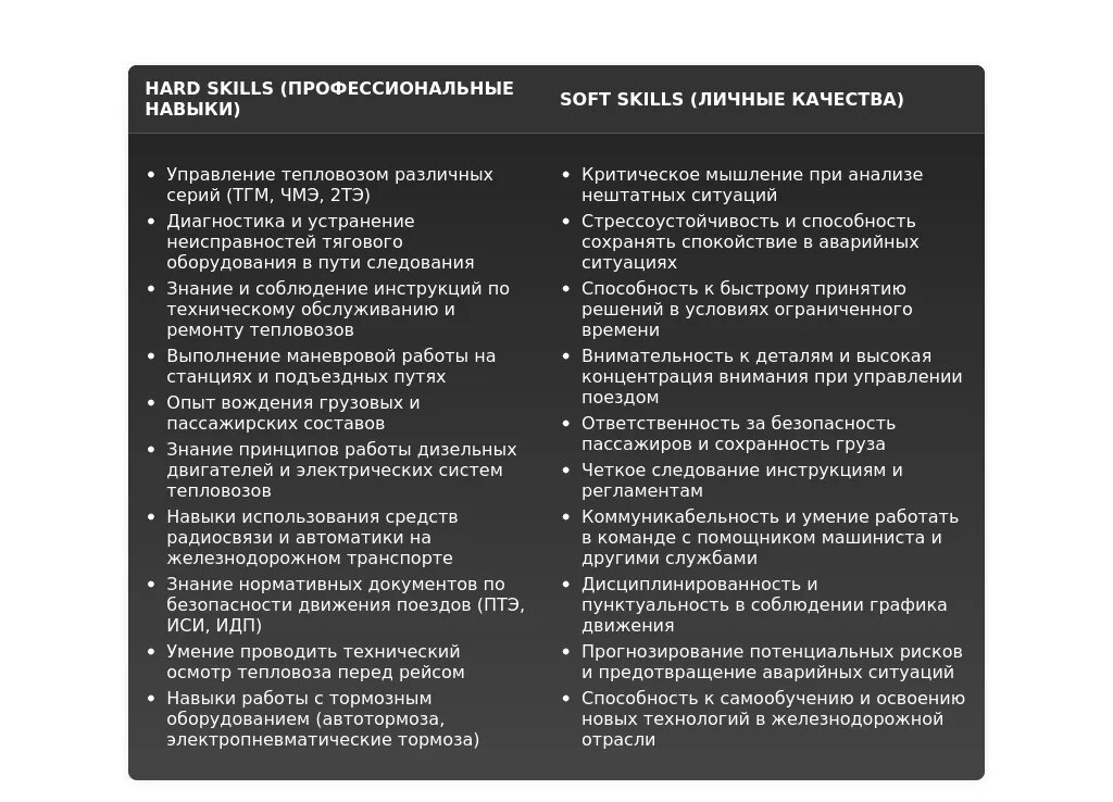 Технические навыки: Управление тепловозами серий 2ТЭ116, 2ТЭ10, знание устройства и принципов работы локомотивов, проведение технического обслуживания. Навыки безопасности: Знание ПТЭ, ИСИ, ИДП, соблюдение требований безопасности движения, предотвращение аварийных ситуаций. Навыки управления: Выполнение графика движения, управление режимами работы локомотива, оптимизация расхода топлива. Личные качества: Ответственность, внимательность, дисциплинированность.