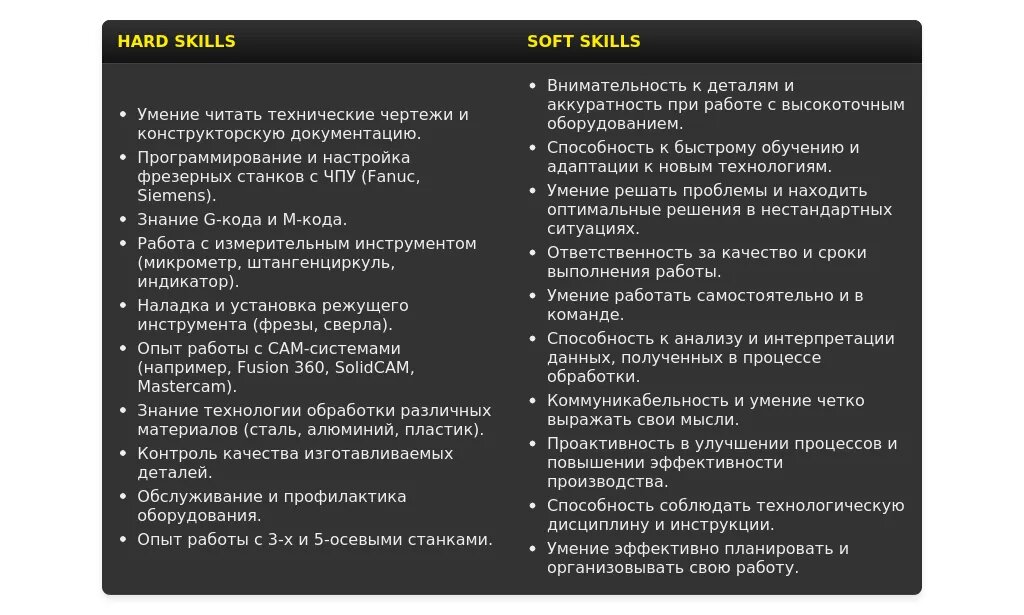 До: "Навыки: Работа на станках ЧПУ, чтение чертежей, знание допусков и посадок, контроль качества."