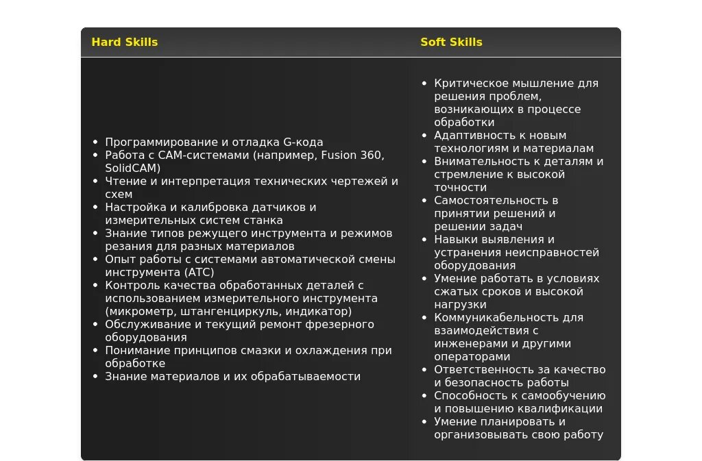 Работа со станками: *Fanuc (эксперт), универсальные фрезерные станки (продвинутый).* Программирование: *Разработка и оптимизация программ ЧПУ (продвинутый).* Контроль качества: *Измерение деталей с использованием измерительного инструмента (продвинутый), контроль качества поверхности (средний).* Чтение чертежей: *Чтение и понимание сложных чертежей (эксперт).*