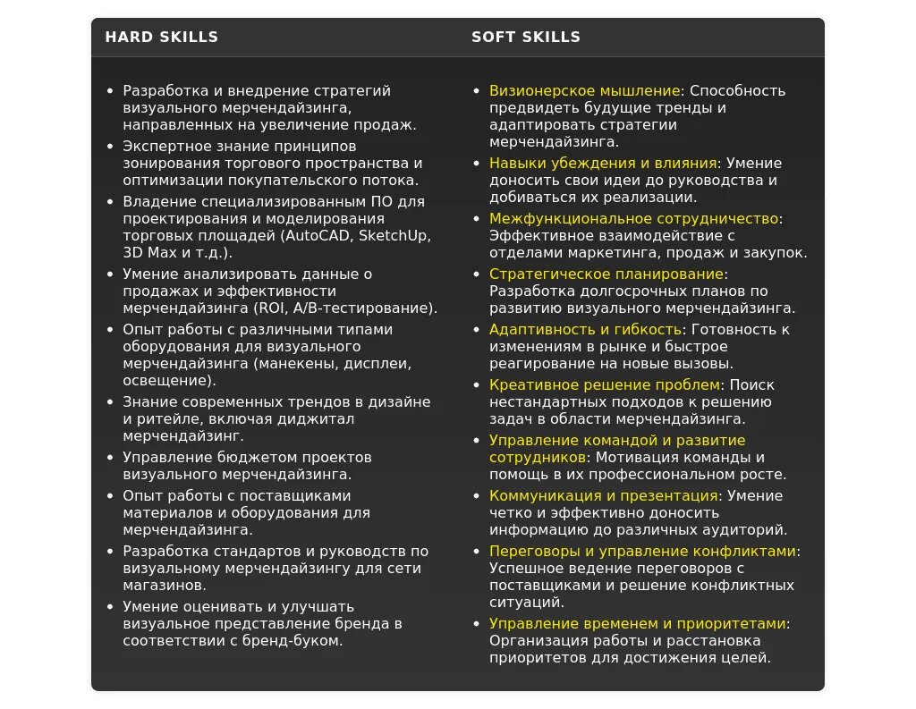 "Навыки: Управление командой, разработка визуальных концепций, выкладка товара, анализ продаж."