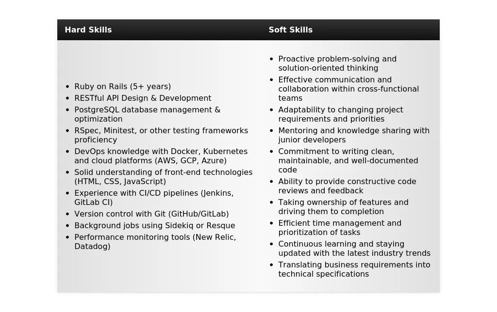 Используйте ключевые слова, которые часто встречаются в описаниях вакансий для Ruby on Rails разработчиков. Это поможет вашему резюме пройти через системы отслеживания кандидатов (ATS) и привлечь внимание рекрутеров.