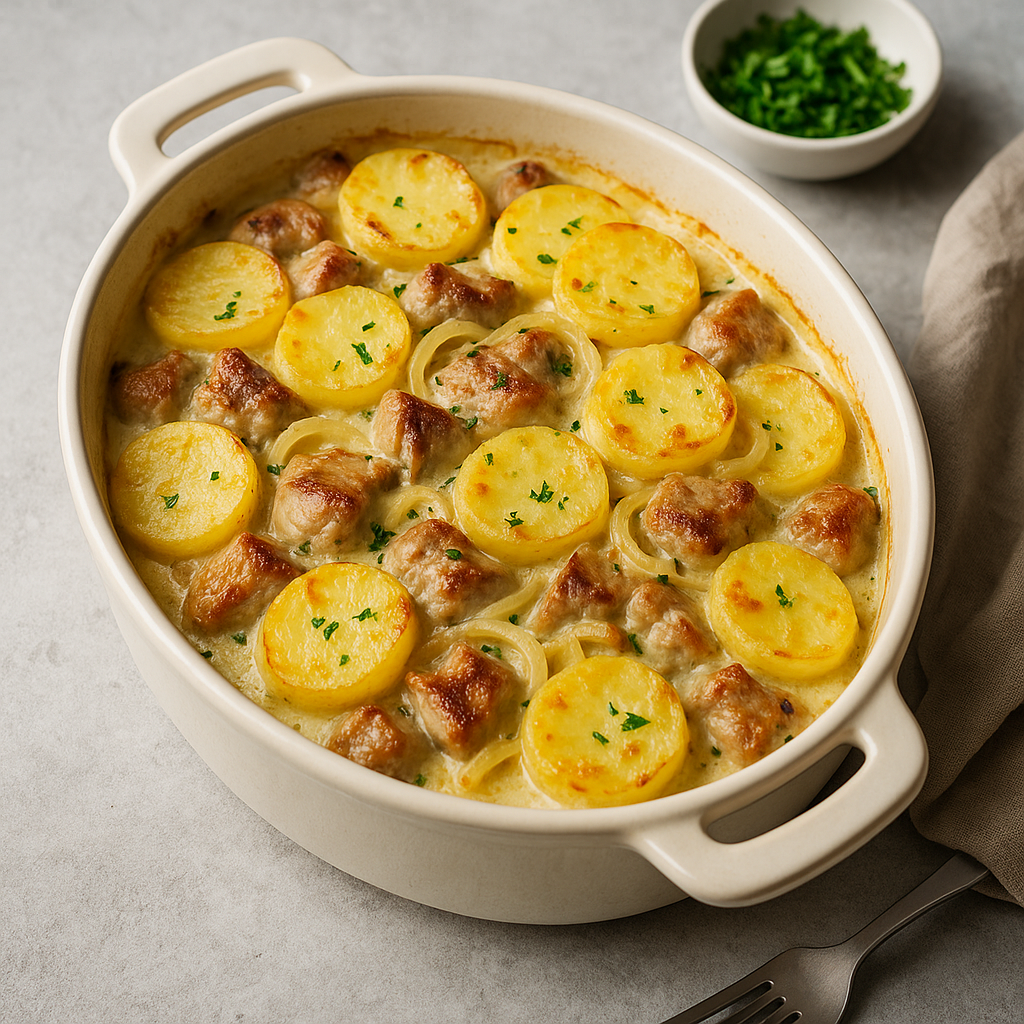 Если вы ищете блюдо, которое сочетает в себе сытность, аромат и простоту приготовления — вы по адресу. Запечённая свинина с картофелем и луком в сливках — это тот рецепт, который однажды попробовав, вы захотите повторять снова и снова. Мягкое мясо, нежный картофель, карамелизированный лук и сливочный соус — всё это готовится в одной форме и практически не требует внимания после подготовки. Это отличное решение для семейного ужина, гостей или даже воскресного обеда. В этой статье вы найдёте не просто список ингредиентов, а подробное пошаговое руководство с советами, как добиться идеального вкуса, текстуры и аромата. Ингредиенты (на 4–6 порций): Шаг 1: Подготовка мяса Выбирайте мясо с мраморными прожилками — шея или лопатка подойдут идеально. Нарежьте свинину порционными кусочками примерно 3 на 3 см. Слегка отбейте плоской стороной ножа, чтобы мясо стало мягче и быстрее приготовилось. Посолите, поперчите, добавьте немного растительного масла, рубленый чеснок и сухие травы. Перемешайте