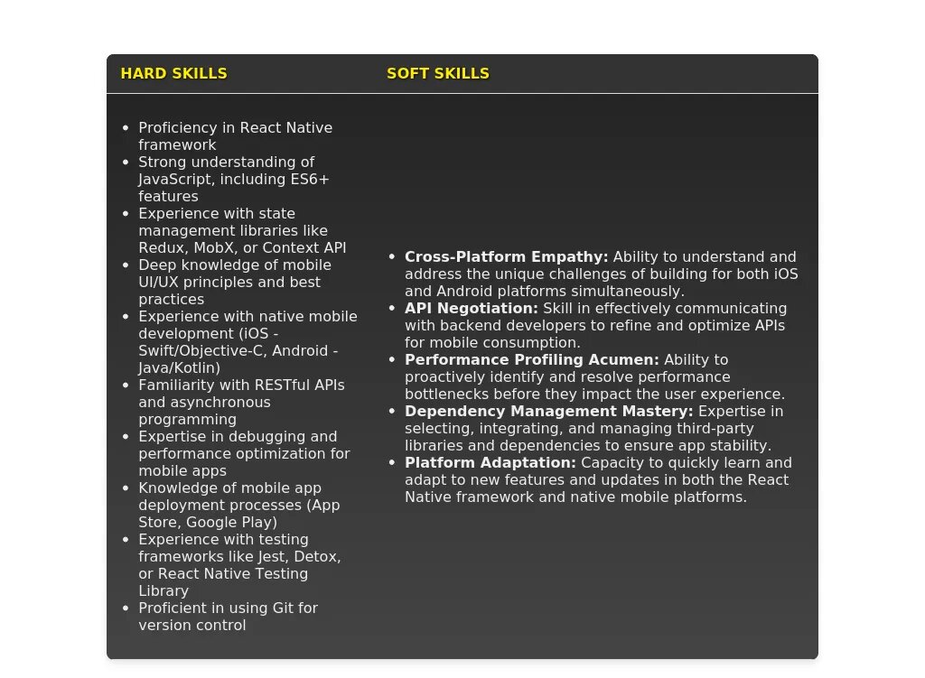 - Укажите свой уровень владения каждым навыком: Например, "React Native (эксперт)", "Redux (продвинутый)", "TypeScript (средний)".