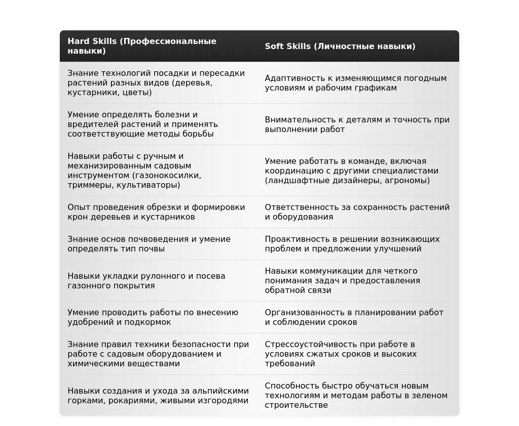 - Профессиональные навыки: Уход за растениями (эксперт), работа с ручным инструментом (продвинутый).