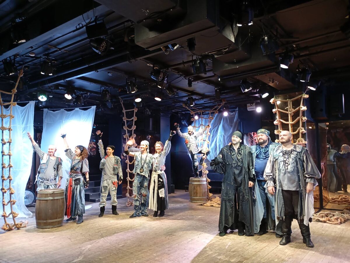 Если бы происходили соревнования по невнимательности, я заняла бы первое место. Это безнадежно и не лечится, увы. Поэтому когда я, придя в Театр на юго-западе на спектакль по Стивенсону, обнаружила, что, собственно, Стивенсоном тут и не пахнет, я даже не особенно удивилась. Правда, я была не одна такая, судя по разговорам. Спектакль назывался "В поисках сокровищ", здесь было и широкое синее море, и пираты, мечтающие завладеть заветным сундуков, и отчаянная храбрость, и любовь, и потерянные дети. В общем, было все то, что принято называть словом, которое обожают дети и подростки. ПРИКЛЮЧЕНИЯ. Да, это совершенно классический приключенческий спектакль. Вот прям как будто поставлен по романам Сальгари, Стивенсона и иже с ними. И чисто по сюжету он очень традиционный (в хорошем смысле): добротный, с правильной моралью и даже с цитатой из Шекспира (неожиданно, да). А по форме - совершенно новаторский. Ибо Олег Леушин поставил мюзикл. Реально: пиратский мюзикл, при этом в нем много отсылок к