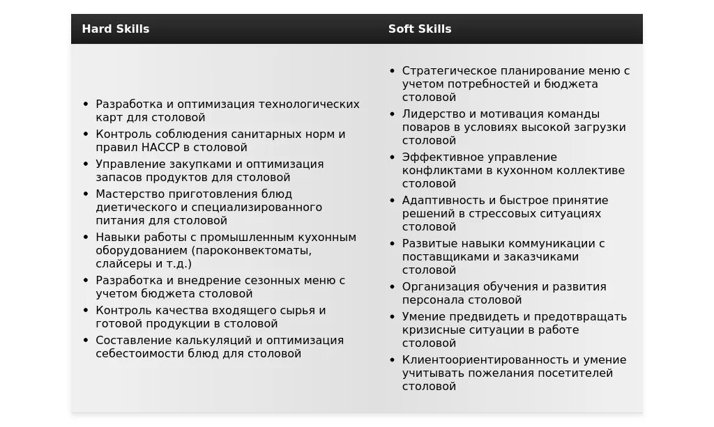 Вместо простого перечисления навыков, сгруппируйте их по категориям, чтобы показать свою экспертизу в различных областях, связанных с работой шеф-повара в столовой. Например: