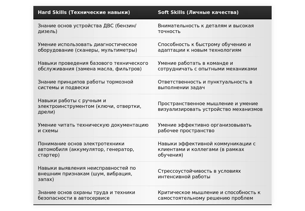 - Для вакансий без опыта работы: "Базовые знания устройства автомобиля", "Навыки работы с инструментом", "Готовность к обучению", "Желание развиваться в сфере авторемонта".