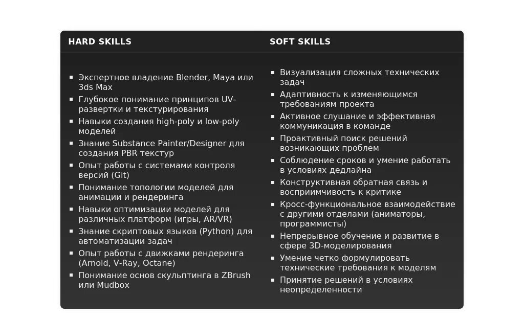 - GameDev: "Создание high-poly/low-poly моделей", "Оптимизация моделей для игровых движков", "Работа с текстурами PBR", "Создание игровых ассетов", "Знание пайплайна разработки игр".