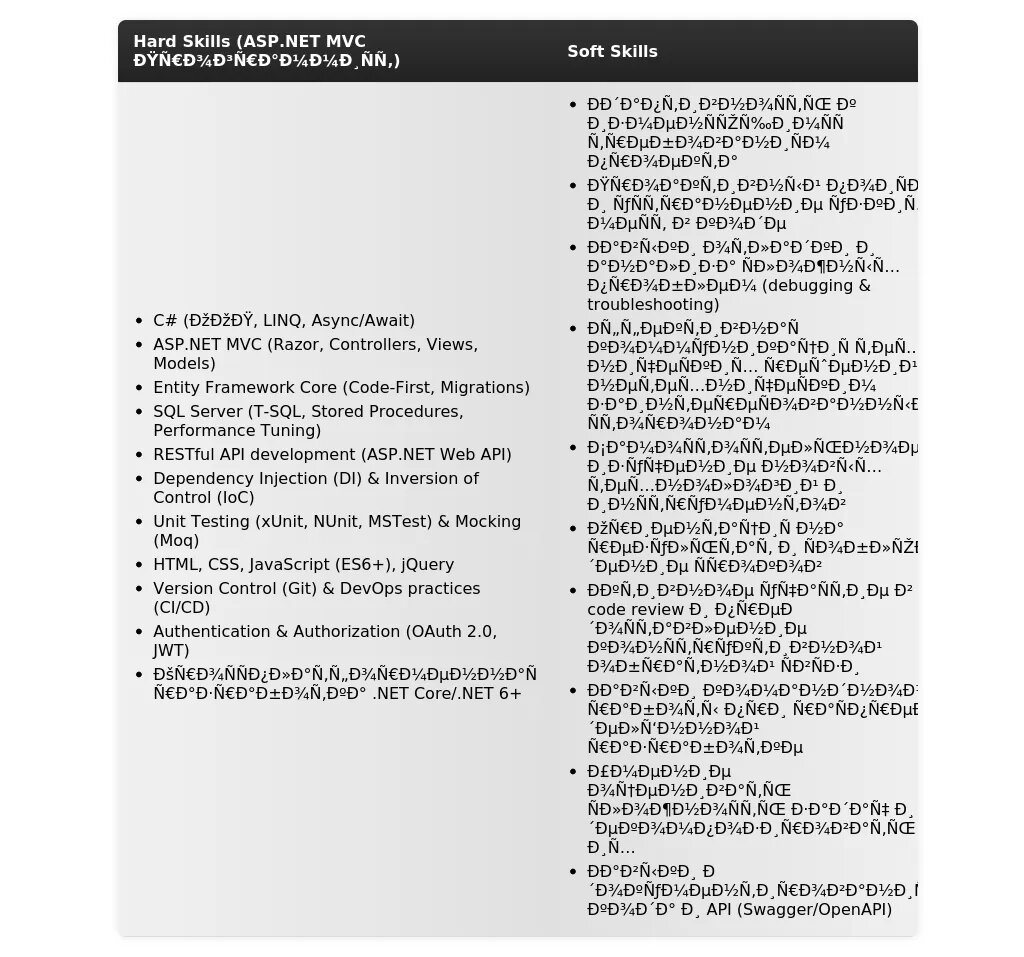 Языки программирования: C# (Продвинутый). Фреймворки: ASP.NET MVC (Продвинутый), Entity Framework (Продвинутый), ASP.NET Core (Средний). Базы данных: SQL Server (Продвинутый). Инструменты: Visual Studio, Git, Azure DevOps.