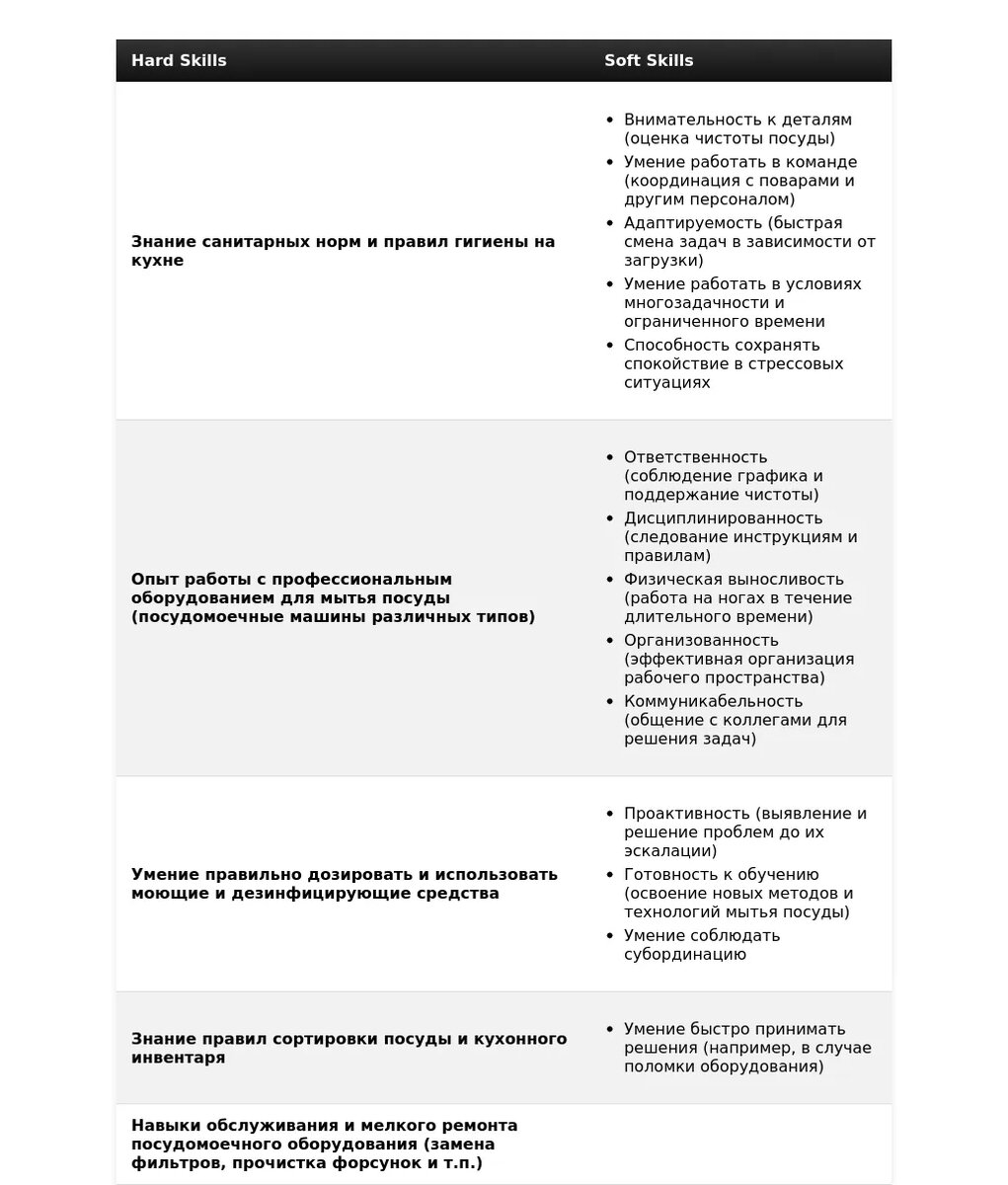 - Для вакансий в ресторанах премиум-класса: "Опыт работы с деликатной посудой...", "Внимательность к деталям...", "Знание моющих средств...".