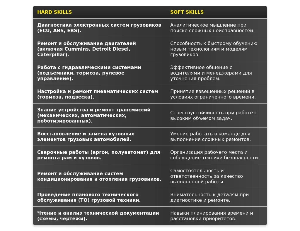 - Для вакансий, связанных с ремонтом конкретной марки грузовиков: "Имею опыт ремонта и обслуживания грузовых автомобилей MAN/Mercedes-Benz/Volvo...", "Знаю особенности конструкции и эксплуатации грузовых автомобилей MAN/Mercedes-Benz/Volvo...".