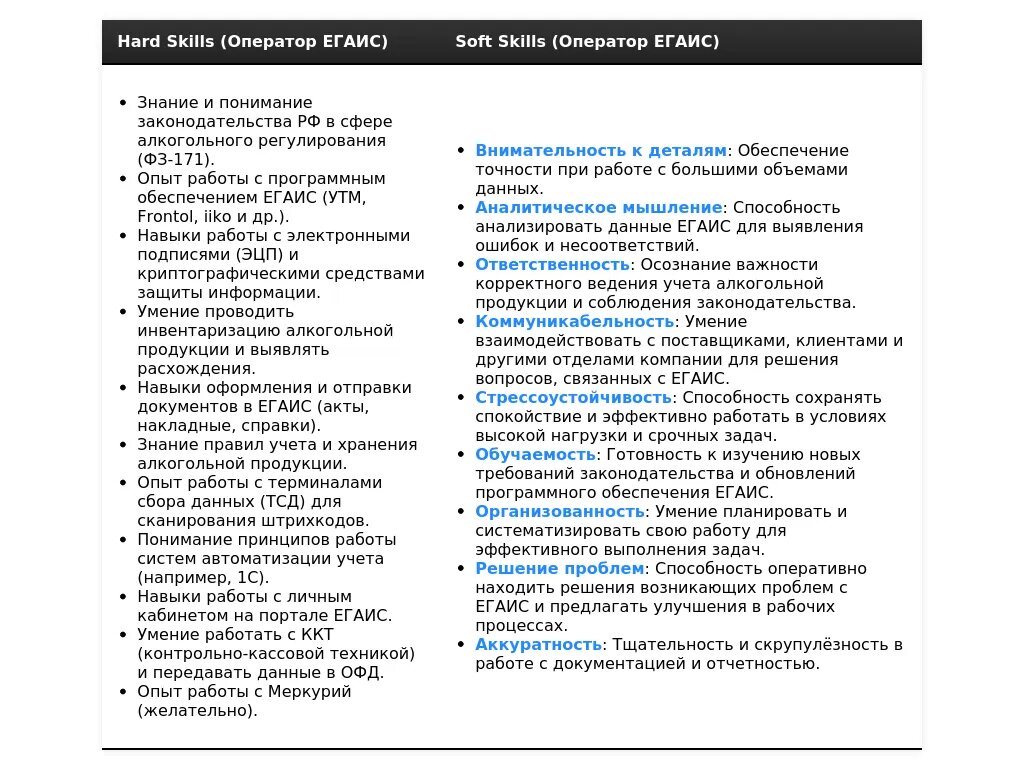 Раздел "Навыки" – это список ваших умений, релевантных для работы оператором ЕГАИС. Важно, чтобы этот список соответствовал требованиям вакансии.