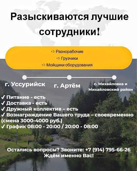 📢📢📢📢📢📢 *ВНИМАНИЕ* 👷🏻♀️👷🏽😍З/П ОТ 80 000 руб. на руки*🔥🔥🔥 Предлагаем работу с человеческими условиями от 18+: ✅ Питание ✅ Доставка до работы ✅ Проживание ✅ График посменный (день/ночь) Дружный коллектив, своевременная оплата труда! 👇🏻Вакансии: ○Грузчики ○Разнорабочие ○Мойщики оборудования Звоните:+79147956626. Барахолка: @uss_baraholka Подписка: @Mark2_chee