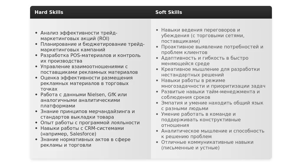 "Коммуникабельность (опыт успешного взаимодействия с розничными сетями), ответственность (соблюдение сроков и бюджета проектов), внимательность к деталям (отсутствие ошибок в документации)."
