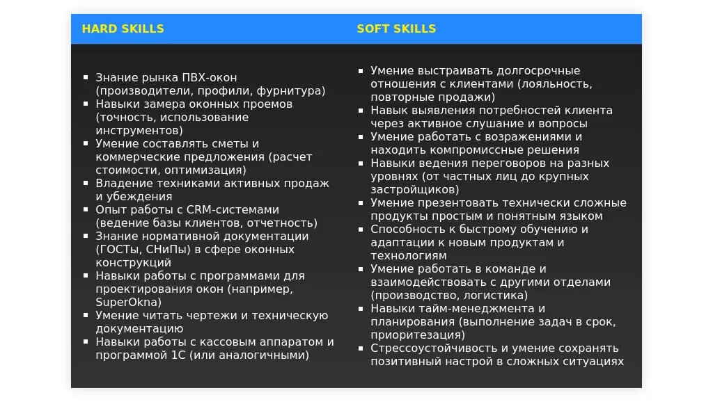 - Обязательная информация:Ключевые навыки и компетенции, релевантные для позиции менеджера по продажам ПВХ-окон.