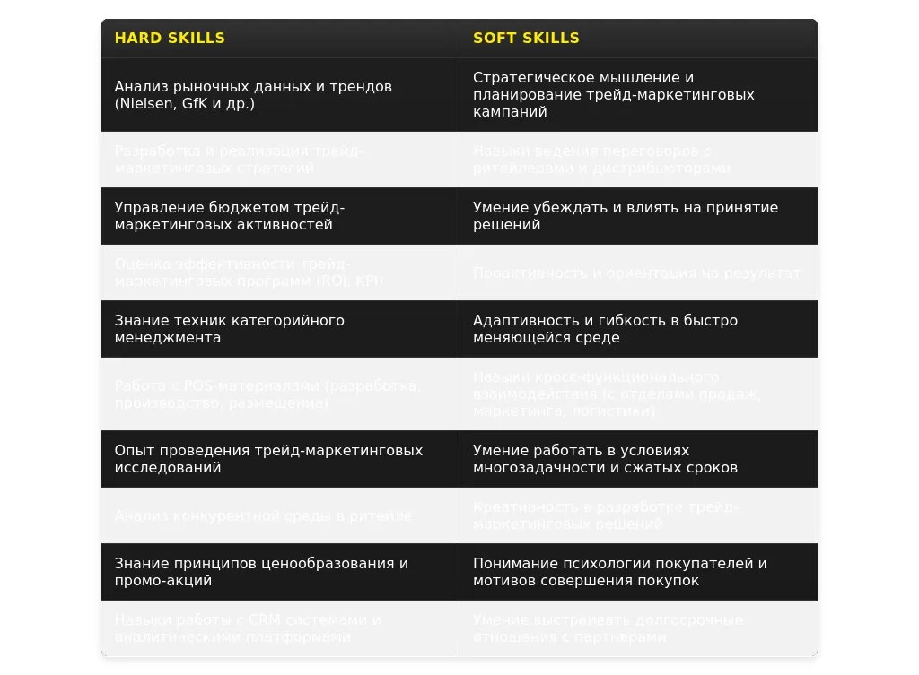 - FMCG: "Работа с сетями ритейла", "Разработка и реализация трейд-маркетинговых активностей", "Анализ эффективности промо-акций", "Бюджетирование".