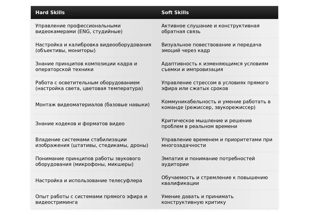- Знание операторского оборудования и программного обеспечения для обработки видео.