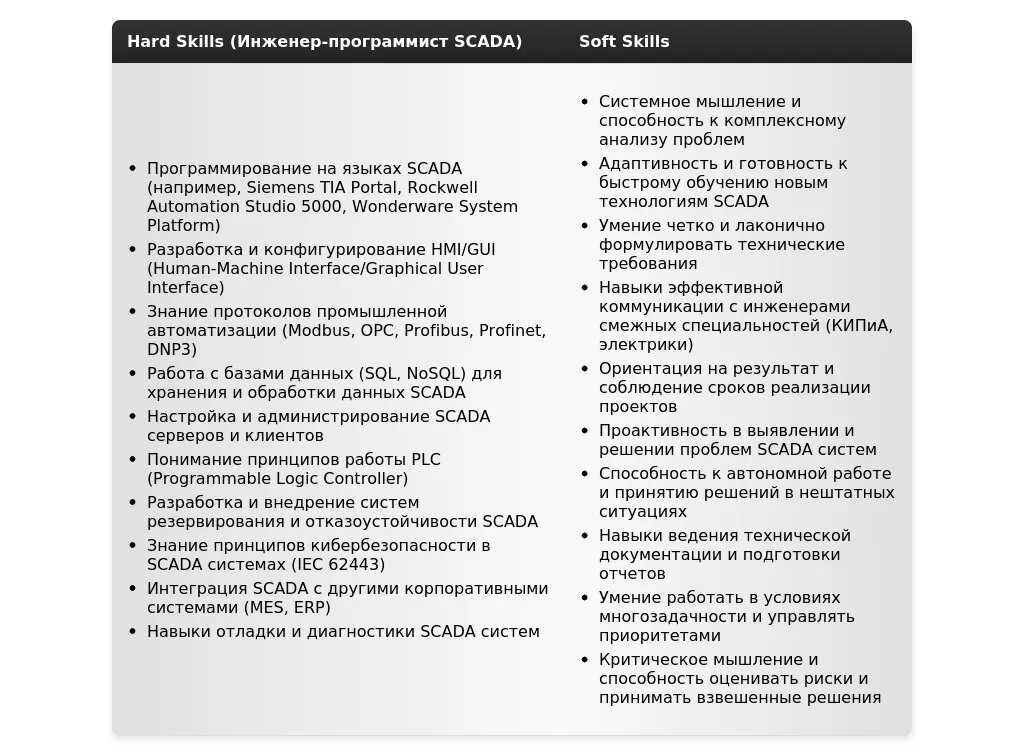 Ключевые навыки и компетенции, релевантные для SCADA (например, знание языков программирования, опыт работы с конкретными платформами SCADA, навыки разработки HMI).