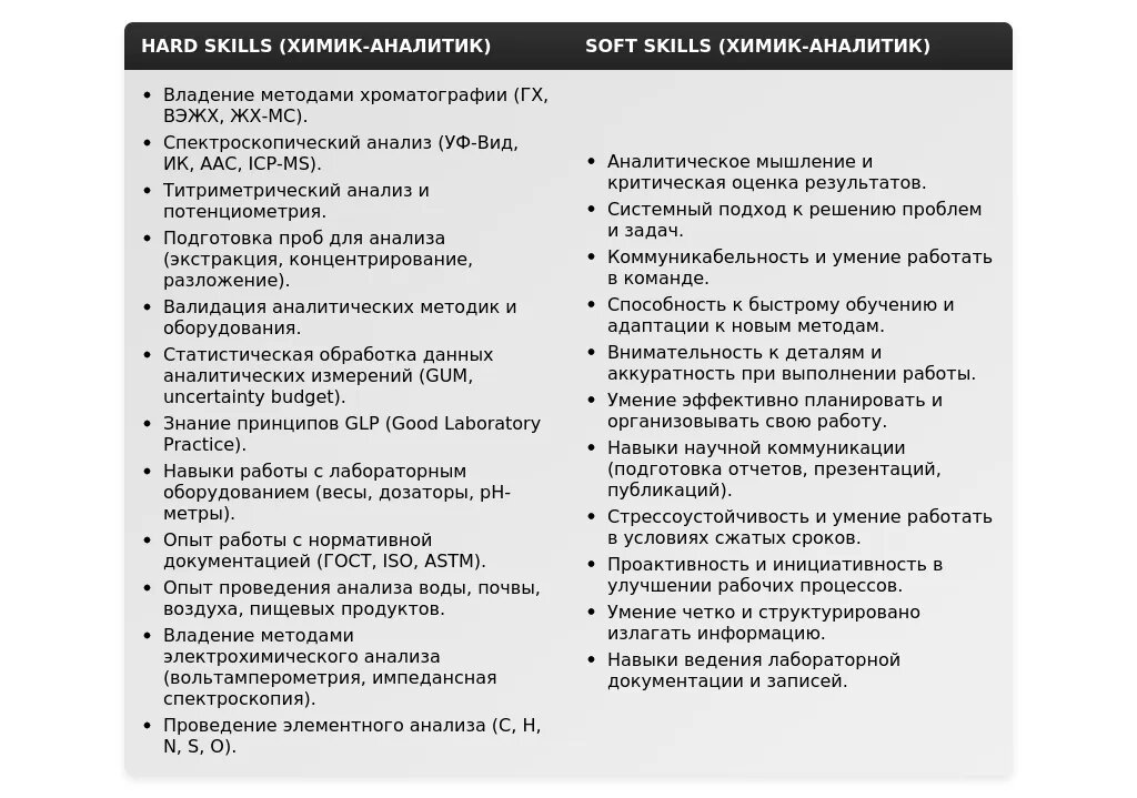 Анализ: *Обязателен опыт работы именно в фармацевтике и знание стандартов GMP/GLP*. В резюме нужно акцентировать внимание на опыте работы с ВЭЖХ и ГХ, если он есть.