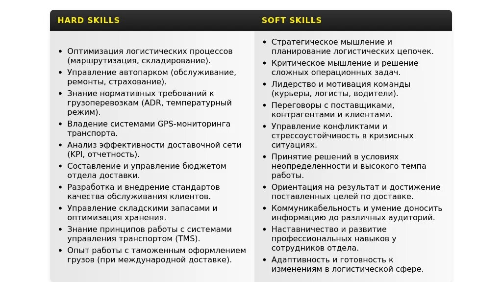 Анализ: Обязательные требования – опыт работы, знание 1С и опыт управления большим автопарком. Скрытое требование – умение работать в условиях высокой загруженности и соблюдения строгих сроков, так как это крупная логистическая компания.