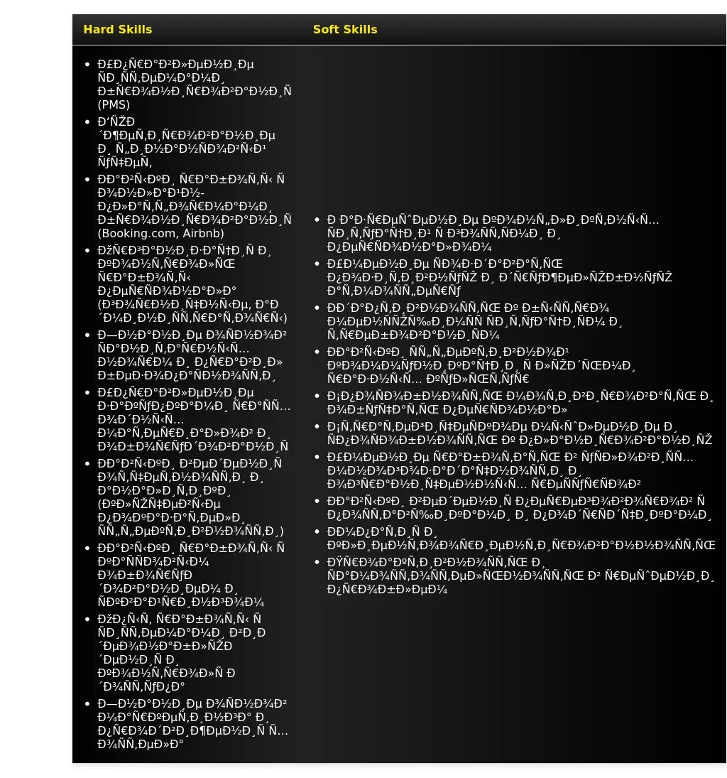 "Управляющий хостелом с 3-летним опытом, специализирующийся на повышении уровня удовлетворенности гостей и оптимизации операционных процессов. Обладаю отличными коммуникативными навыками и опытом работы с системами бронирования. Стремлюсь применить свой опыт и знания для повышения прибыльности и улучшения репутации вашего хостела."