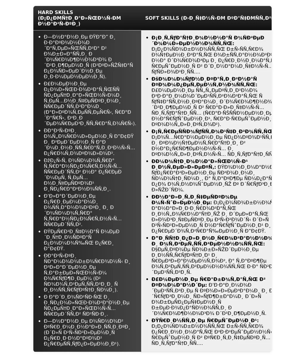 - Раздел "Навыки" перегруппирован и содержит требуемые компетенции.
