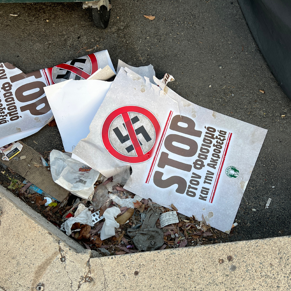 Какие-то немножко больные делали плакаты против фашизма и ультраправых, чтобы развесить по Спирусу Киприану улице у Лимасоле. Спрашивается вопрос: за кого держать того, кто эти плакаты сорвал — за ультраправых или фашистов?