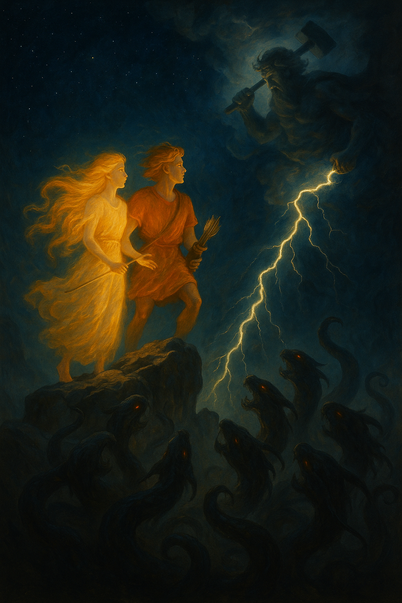 Давным-давно, когда Земля была плоской, и покоилась на спинах слонов, а Боги были молоды, и чаще общались со своими подопечными – людьми, самым любимым и почитаемым был Бог Солнца. Каждый день сияющий Бог вел свою колесницу по небесному склону, разгоняя созданий мрака, согревая и освещая Землю, даря людям защиту и возможность выращивать и добывать пищу. Ночью же, когда колесница Бога Солнца скрывалась за горизонтом, Бог Ночи укрывал Землю своими крыльями, выпуская своих созданий мрака, заставляя людей прятаться за крепкими стенами домов от его созданий-кошмаров, и только Богиня Луны несла свет во тьме. Но она боялась Бога Ночи и никогда не приближалась к Земле, опасаясь его злого мрака. Были у Бога Солнца дети. Заря вставала раньше всех, запрягала колесницу отца, и выпускала стрелы-лучи, разгоняя завесу, созданную Богом Ночи, открывая отцу путь по небосклону. Ее младший брат – Закат, вечером встречал колесницу отца, распрягал коней и уводил их на ночной отдых. Беззаботны и счастливы бы
