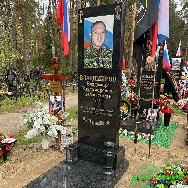 Над могилой российского воина, погибшего за Родину в специальной военной операции, возвышается простой, но выразительный монумент из габбро-диабаза. На лицевой стороне памятника — цветная керамическая фотография солдата. Его взгляд, полный мудрости, устремлён прямо на нас. Этот взгляд проникает в самое сердце, напоминая о жертве, принесенной ради мира и свободы. Светлые, добрые глаза солдата кажутся живыми. По бокам от фотографии — крест и орден Мужества. Эти символы говорят о том, что Бог и правда на стороне русских героев. Они олицетворяют нерушимую силу, защищающую мир от тьмы. Ниже, под портретом, высечена надпись, выполненная методом пескоструйной обработки и покрытая сусальным золотом. Золотые буквы на чёрном фоне сияют, словно огоньки в ночи, повествуя нам о подвиге героя. На обратной стороне монумента лазером нанесено изображение скорбящего ангела. Он охраняет покой воина. Над ангелом кружатся белые голубки - символ чистой души, самоотверженности. Этот строгий, но величественны