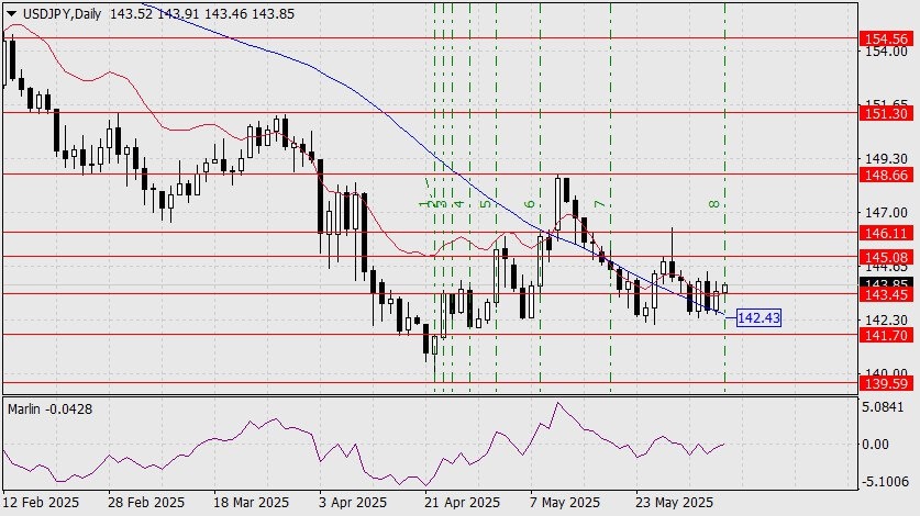 https://basechop.ru/wordpress/?p=45157 По паре USD/JPY к сегодняшнему утру сложилась совершенно двойственная ситуация, то есть с одинаковой вероятностью как роста, так и падения. О росте нам говорят закрепление цены над уровнем 143.45, невозможность цены уйти под линию Крузенштерна и нахождение текущей свечи точно на временной линии Фибоначчи с растущим намерением. Линия осциллятора Марлин тестирует границу с территорией роста, здесь тоже вероятность выхода вверх чуть больше вероятности разворота вниз. Но даже если свеча сегодняшнего дня окажется чёрной, то уже в понедельник новая свеча должна закрепиться под линией Крузенштерна (142.43), иначе и этот медвежий порыв окажется кратковременным. Цель роста 146.11. Уровень 145.08 в текущей ситуации представляется промежуточным. Если сегодняшние нонфармы ослабят доллар, то основной целью снижения выступит уровень 139.59, который может быть достигнут за 2-3 дня. На четырёхчасовом графике цена растёт над индикаторными линиями, над уровнем…