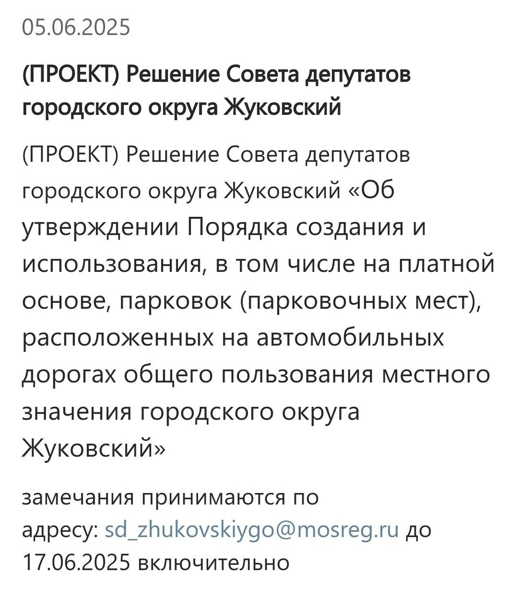 #документы Совет Депутатов выкатил Проект создания платных парковок на территории г.о. Жуковский. Если Вы против данного проекта - пишите письма в адрес Совета Депутатов. @zhuk_city