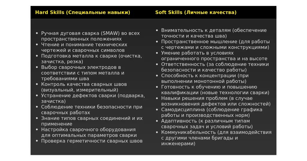 - Для машиностроения: "Сварка легированных сталей", "сварка сложных конструкций", "чтение чертежей", "соблюдение ГОСТов и СНиПов".