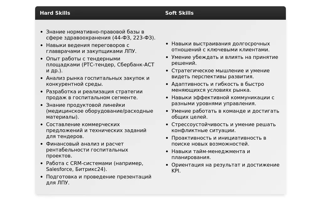Ключевые навыки и компетенции, релевантные для позиции менеджера госпитальных продаж.