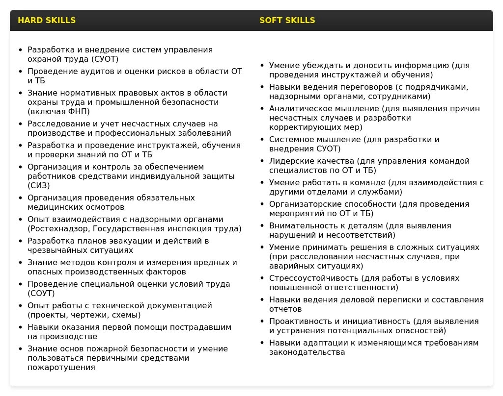 "Профессиональные навыки: Знание правил безопасности при работе с оборудованием, опыт проведения аудитов по охране труда, разработка мероприятий по улучшению условий труда, внедрение системы управления охраной труда. Навыки работы с программным обеспечением: MS Office, специализированные программы для учета и анализа данных по охране труда. Личностные качества: Внимательность к деталям, умение работать в команде, аналитическое мышление."